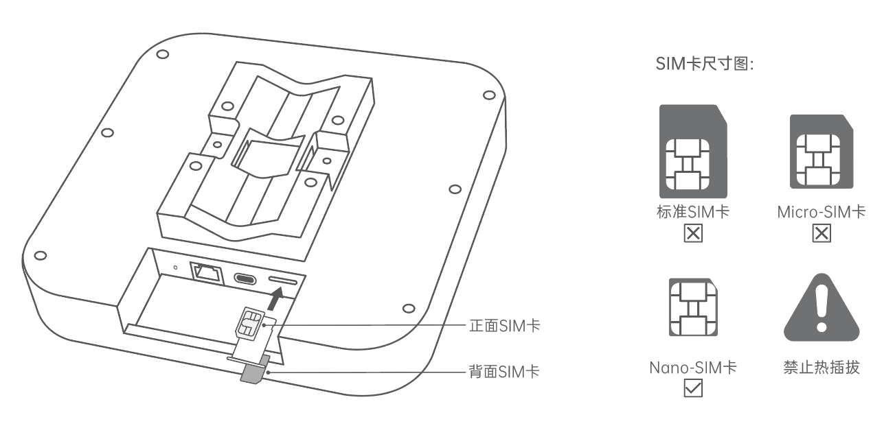 AK68-788支持2张外置卡,如下图示把外置卡放到AK68-788中。需要确保外置卡可正常使用,优先建议把外置卡放到SIM1卡槽内。