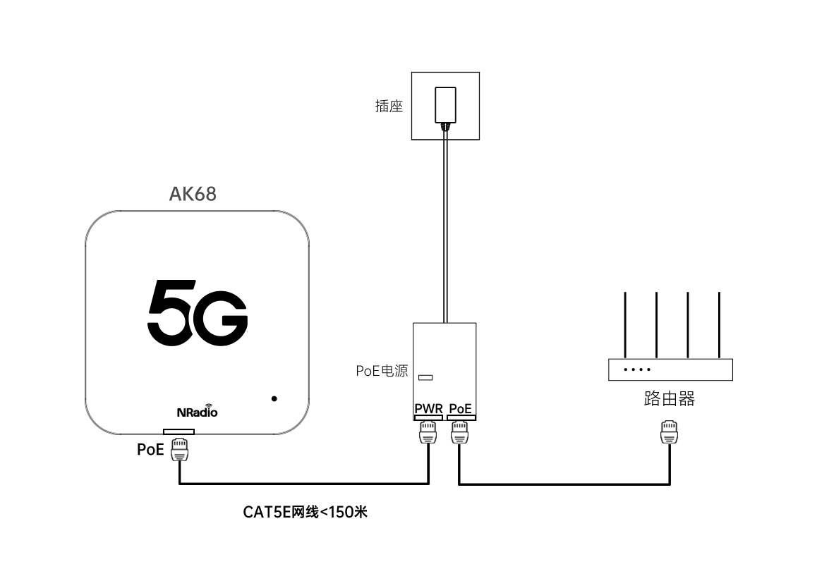 如下方的连接示意图所示,进行连接。 特别注意,AK68-788通过网线,连接到电源适配器PWR标注的网口上。路由器通过网线,连接到电源适配器PoE标注的网口上。 连接示意图如下: